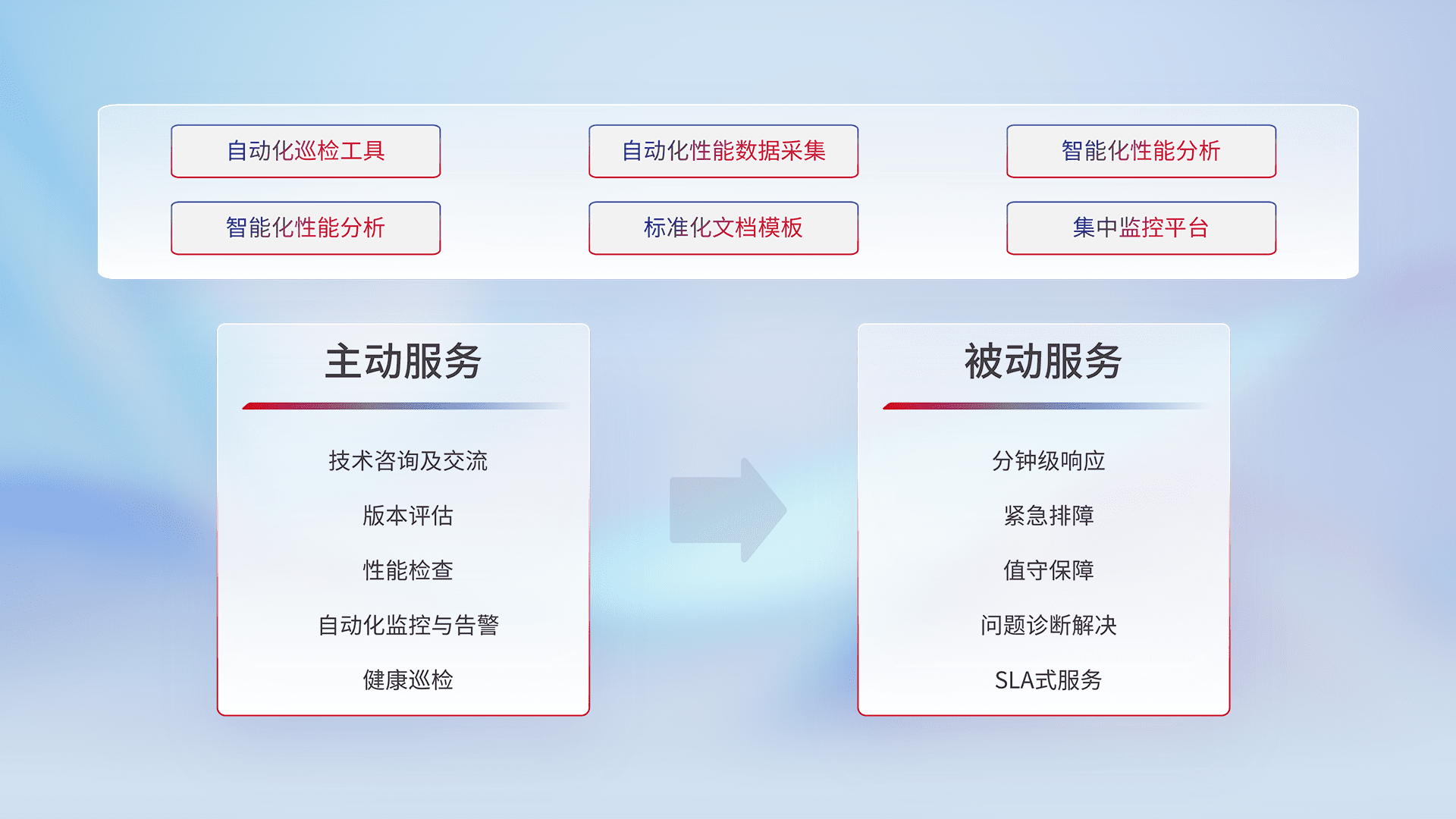 智能化工具和标准化文档,,,保障服务质量,,,,提供主动服务(包含技术咨询、、、版本评估、、、性能检查、、、、自动化监控与告警、、、、健康巡检)和被动服务包含(分钟级响应、、、紧急排障、、、值守保障、、问题诊断解决、、、SLA服务)。。。